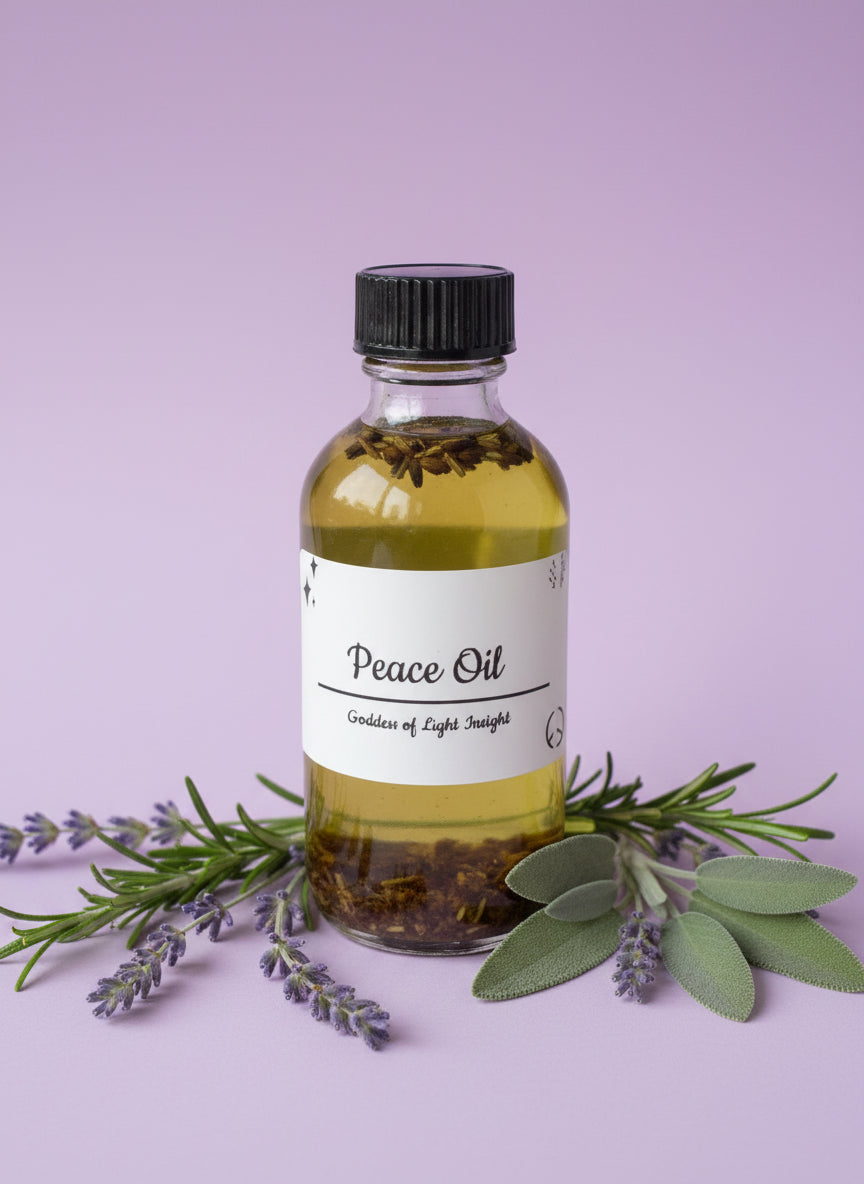 Peace Oil – A soothing Hoodoo blend crafted to bring harmony, calm, and emotional balance.